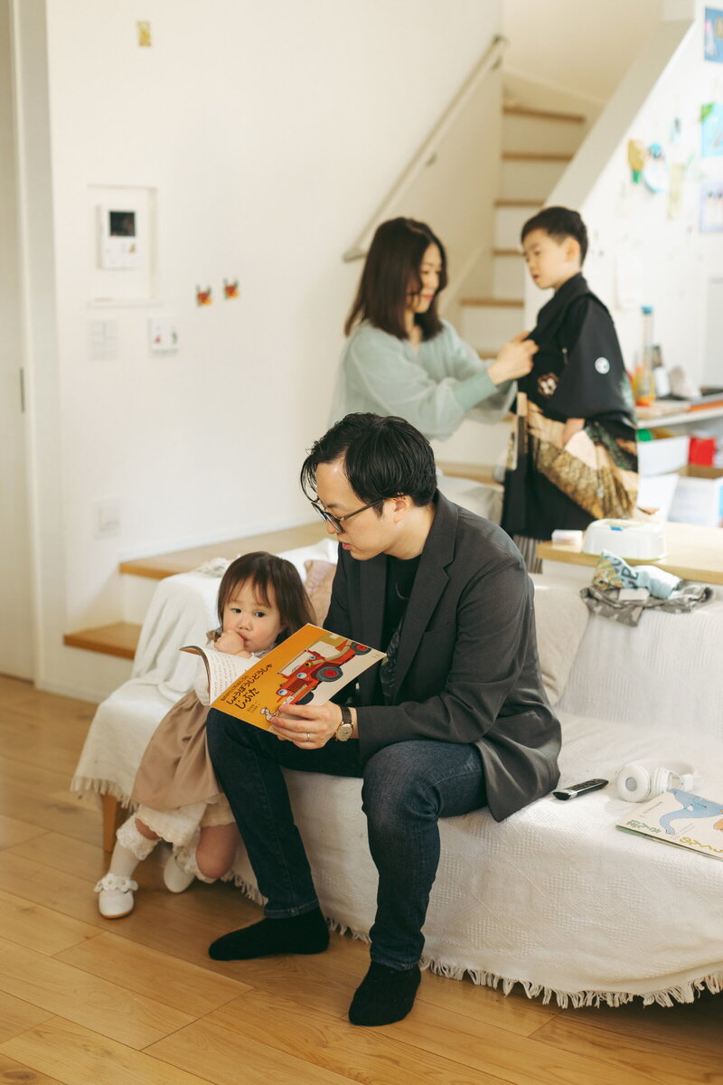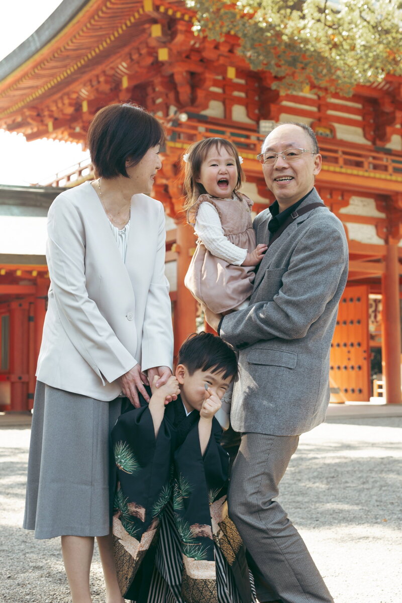 お支度から撮影させていただきました。いつもと違う朝にお子様お二人もドキドキワクワク。少し時期をずらしたため、冬の光が優しく、神社の人混みも少なく穏やかな時間が流れる七五三でした。久々のじいじばあばとの再会に喜ぶ様子はこちらまで笑顔に。その瞬間も残せたことも嬉しく思います。
